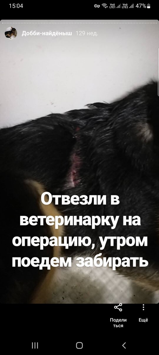 Итак, мы принесли его домой и обнаружили на его боку большую рану. Видно, что собака была очень напугана, и ему было больно. Помните, я говорила, что была уверена практически на 100%, что его хозяева скоро найдутся, так как подобрали мы его на месте, где гуляли с маленькими собачками. Я позвонила 1 знакомой девушке, которая как раз была вхожа в эту компанию, и выслала ей его фотку. На что она написала, что не знает эту собаку. Я была в шоке. Что же нам теперь с ним делать? Мне показалось, что он был очень голодным, но у нас даже не было корма для маленьких собак, чтобы его накормить. Корм мне принесла как раз эта девушка, с которой я созванивалась, она же мне и сообщила, что вышла в интернет и увидела: 2 днями ранее уже выставлялся пост о о том, что эту собачку уже находили парень с девушкой. Но как же он опять оказался на улице и уже с раной на боку, ведь в объявлении этого не было сказано. Я стала набирать номер, который был дан в том объявлении, долго трубку никто не брал, весь веч