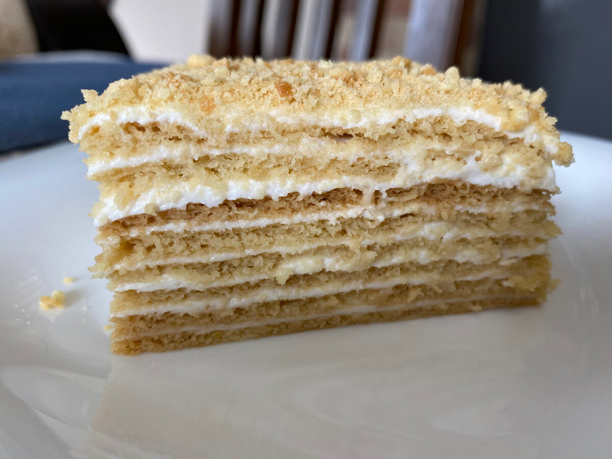 Медовик🐝💛 🐝Заранее 100г сливочного масла растапливаем и даём немного остыть. Муку 600-700г смешиваем с 1 чайной ложкой соды. ❗️❗️❗️Важно, указанное количество муки - приблизительное! Точное количество зависит от сорта муки и ее качества. 🐝Берём чашу, разбиваем в неё 2 яйца и насыпаем 200г сахара. Добавляем растопленное сливочное масло и 2 столовых ложки жидкого мёда. Все хорошо перемешать и поставить на паровую баню. Греем до тех пор, пока сахар не растворится. Убираем массу с огня. 🐝Далее добавляем муку с содой и замешиваем тесто. ❗️❗️❗️Правильное тесто должно прилипать к рукам. Муки нужно немного не доложить, а в процессе раскатки добавлять ее! 🐝Начинаем раскатывать тесто нужного вам размера. Выпекать коржи в заранее разогретой духовке до 200 градусов по три минутки. Готовим крем💛 Самый лучший крем для медовика - сметанный. 🐝Сметану 800г 25% жирности смешиваем с сахарной пудрой (100-150г). 🐝Промазываем коржи кремом и оставляем его пропитываться на 2 часа. Торт получи