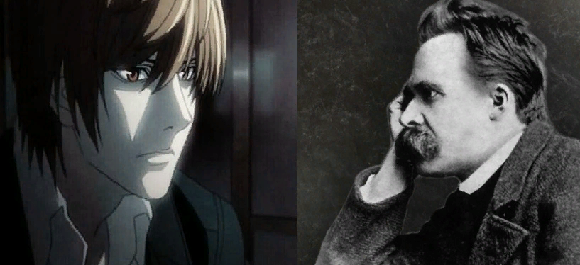 «Кто сражается с чудовищами, тот пусть остерегается чтобы самому при этом не стать чудовищем» Фридрих Ницше «Тварь дрожащая или право имею», — откуда же взялась эта фраза о человеке вершителе судеб, которая приходит в голову после прочтения манги? Фридрих Ницше. Философ, который изменил историю западной философии навсегда. Так где же его следы в японской манге? Мы утверждаем, что Ягами Лайт отражает философские воззрения Ницше, но и как люди они имеют много схожего. Как и Ницше, Ягами Лайт был первенцем в относительно зажиточной семье. Позже у него появилась сестра, с которой он был в хороших отношениях. Ницше получил профессорскую степень в 24 года, что было немыслимо по тем временам, все его современники отмечали острый ум и таланты (Ницше знал минимум 10 языков). Главный герой «Тетради смерти» также умён не по годам, превосходя всех своих сверстников в умственных способностях. Они оба бросают вызов обществу, в конечном счете, заканчивая свою жизнь печально — сходя с ума. После смер