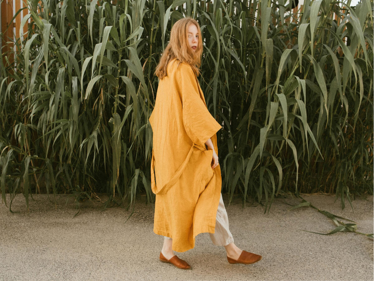 Очень рекомендую присмотреться к платью-тренчу из льна, который можно носить не только как платье, но и как верхний слой в прохладную погоду. А если у Вас в гардеробе нет плаща, то присмотритесь к льняному бежево-серому плащу, который предлагает бренд.