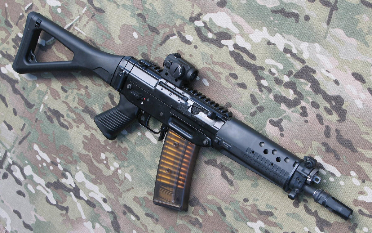 История создания Штурмовая винтовка (автомат) SG-550 была разработана в 1979-1980 годах швейцарской компанией SIG для участия в конкурсе на новый автомат для швейцарской армии (на замену автомату SIGStgw.57 калибра 7.5х55). Автомат SIG SG-550 создавался на основе предшествовавших ему моделей SIGSG-540 и SG-541, причем основные модификации касались облегчения оружия. В 1983 году SIG SG-550 был официально принят на вооружение швейцарской армии под обозначением Stgw.90, но производство, из-за проблем с финансированием, началось только в 1986 году. Позже на основе SG-550 были разработаны карабин SG-551 и укороченный автомат SG-552, а также их гражданские версии, не имеющие возможности вести огонь очередями. В целом, автоматы семейства SIG SG-550 являются одними из лучших в своем классе, отличаясь высокой надежностью, точностью стрельбы и удобством в обращении. Использует патроны калибра: 5,56×45 мм Добавочная информация Комбинированный диоптрический прицел выполнен по типу прицела герман