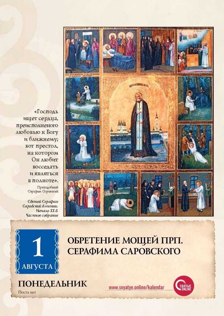 Господь ищет сердца, преисполненного любовью к Богу и ближнему; вот престол, на котором Он любит восседать и являться в полноте. Преподобный Серафим Саровский Обретение мощей Серафима Саровского В 1903 году, через 70 лет после кончины подвижника, состоялось прославление преподобного Серафима Саровского. 19 июля, в день рождения святого, были торжественно открыты его мощи и помещены в приготовленную раку. Родина Преподобного – город Курск, и через 100 лет после обретения его мощей, в 2003 году, в этот день было решено праздновать также Собор Курских святых. В 1903 году была опубликована Беседа преподобного Серафима Саровского о цели христианской жизни с Николаем Александровичем Мотовиловым, которая стала драгоценным вкладом в сокровищницу русского святоотеческого учения. «Пост, молитва, бдение и всякие другие дела христианские, – учил Преподобный, – сколько ни хороши сами по себе, однако не в делании лишь только их состоит цель нашей жизни христианской, хотя они и служат средствами для