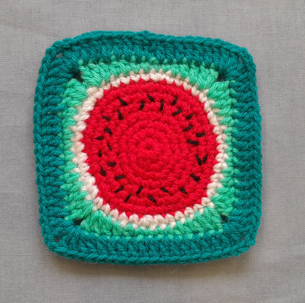 Квадрат освежающий (автор Илария Калири) уровень — легкий Нам понадобятся: - следующие цвета: красный, белый, светло-зеленый и темно-зеленый - крючок 3 мм - маркер Этот квадрат вяжется почти так же как и апельсиновый слайс. https://zen.yandex.ru/media/id/62ba48cc20ac0a4980041673/apelsinovyi-slais-sedobnye-kvadraty-62dd0ee9b57b8236325b32f8 Квадрат вяжется по кругу, не поворачивая вязания, часть квадрата вяжется по спирали без соединения соединительной петлей. Начало ряда отмечается маркером для удобства. Делаем волшебную петлю нитью красного цвета. 1 ряд. Связать 1 воздушную петлю (в.п.) (не считается как столбик), далее 6 столбиков без накида (ст.б/н), затянули петлю. Далее вяжем по спирали, начало ряда отмечаем маркером. 2 ряд Связать по 2 ст.б/н в каждую петлю предыдущего ряда. (12 ст.) 3 ряд 1 ст. б/н, 2 ст.б/н в одну петлю, повторить всего 6 раз.(18 ст.) 4 ряд По 1 ст.б/н в следующие 2 петли, 2 ст.б/н в одну петлю, повторить всего 6 раз. (24 ст.) 5 ряд По 1 ст.б/н в следующие 3 пе