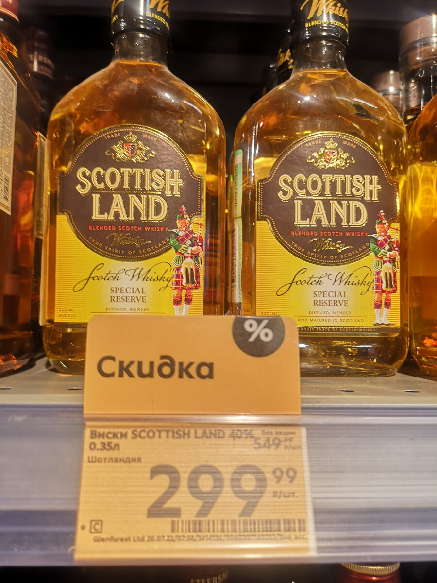 Приветствую всех любителей интересных алкогольных напитков на своем канале! и так зашел я в Пятерочку выбрать какой нибудь виски для коктейлей. Четно признаюсь что раз в месяц мне хочется виски с колой или с яблочным соком. И для этих целей я всегда беру что то не дорогое, лучше всего подходит Белс или что то в этой ценовой категории. Но уже и Белс улетел за 1000 за 0,7 и я решил поискать ему альтернативу. И вот тут я на полке нахожу это: 300 рублей за 0,35 или 600 рублей за 0,7! Цена просто подарок, даже для прошлого года. Я если честно подумал, что это очередное Российское творение, но не тут то было. Это чистокровный Шотландец! И это уже очень интересно. Решено было взять бутылочку на пробу. В интернете к сожалению более конкретной информации по этому виски я не нашел. Прочитал, что он продается в основном в сети Пятерочка примерно с 2018-2019 года. А я на него обратил внимание только сейчас :) И смотрите какой у него цвет. Очень бледно для простого бленда, он хоть и крашеный, но ег