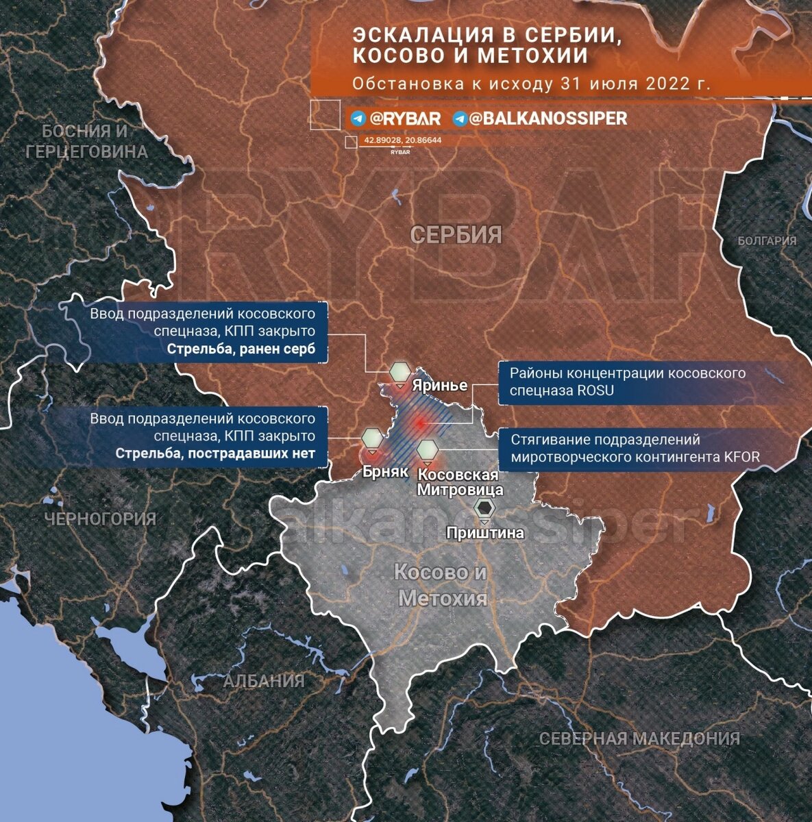 ✅ Миротворческий контингент НАТО KFOR и подразделения ВС Сербии привели в боевую готовность, а косовский спецназ ROSU стянули в приграничные районы на севере края. Вечером прошли переговоры Генштаба Сербии c KFOR, а американский посол в Косово заявил, что уговорил приштинских властей отложить применение скандального решения о номерных знаках до 1 сентября.