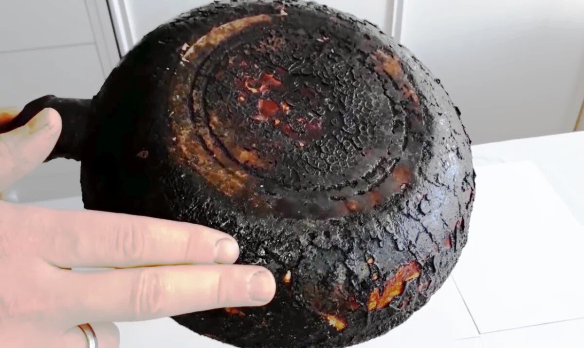 - Потом достаем посудину из средства, даем ей немного остыть и острым ножом соскабливаем нагар с поверхности. Он размягчится и будет легко отходить от сковороды.