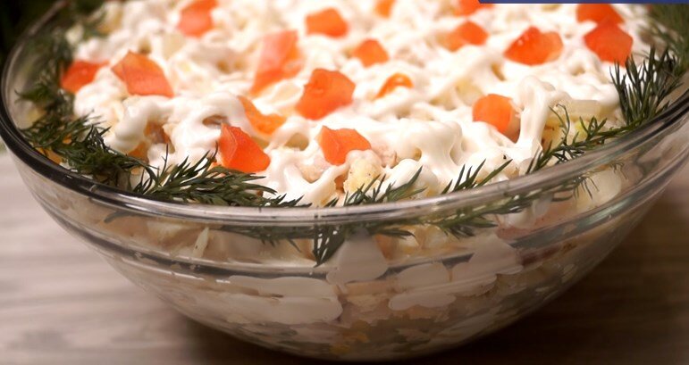 Салат с рыбой, кто пробуют не угадывают какая здесь рыба, а узнав, не верят, что это минтай