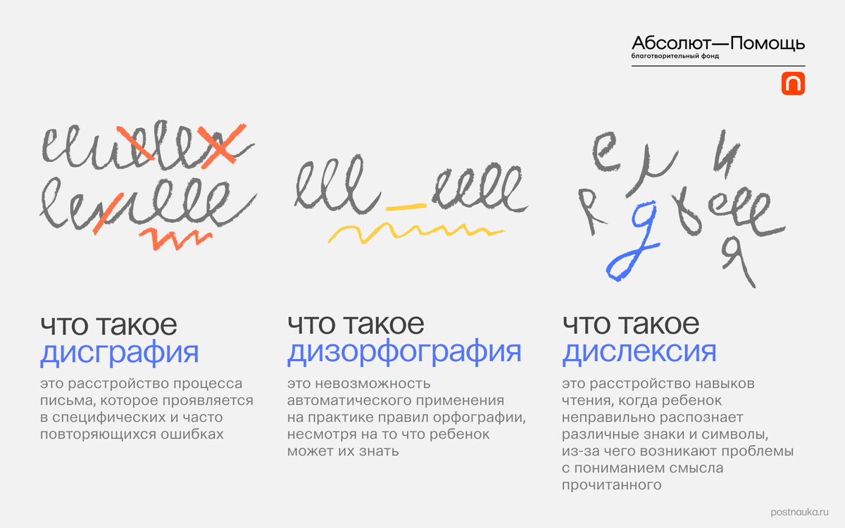 Письмо и чтение — это сложный символический процесс перекодирования звуков в буквы и наоборот, в нем задействовано много функций и систем. И иногда с этой задачей без помощи логопеда справиться нельзя. О том, что такое дисграфия, дислексия и дизорфография, ПостНаука узнала у кандидата педагогических наук, доцента кафедры логопедии МПГУ Натальи Шариповой. Дислексия рассматривается как частичное специфическое расстройство, нарушение чтения. В контексте традиции отечественной логопедии это заключение относится к детям, у которых первично сохранны слух, зрение и интеллект. Это означает, что дислексия характерна для детей с нормотипичным состоянием развития, когда при регулярном обучении не происходит нормативного овладения чтением. Ребенок демонстрирует многочисленные повторяющиеся ошибки стойкого характера: это затруднение слияния букв в слоги и слогов в слова, различного рода аграмматизм (например, написано «у красивой бабочки», а ребенок читает «у красивых бабочки»). В результате искажа