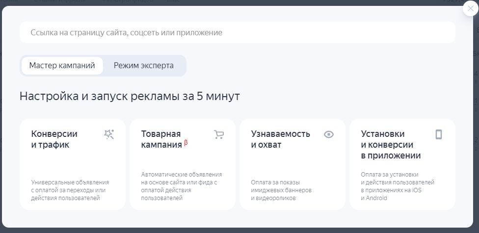 В окне введите ссылку на ваш товар, если вы не эксперт, то советуем пока начать с Мастера компаний, он имеет автоматизированную алгоритмизацию, которая позволит легко добавить вашу первую рекламу. Далее нужно выбрать пред настройку, наиболее оптимальным является "Конверсии и трафик", а уже какой лучше выбирать Вам.