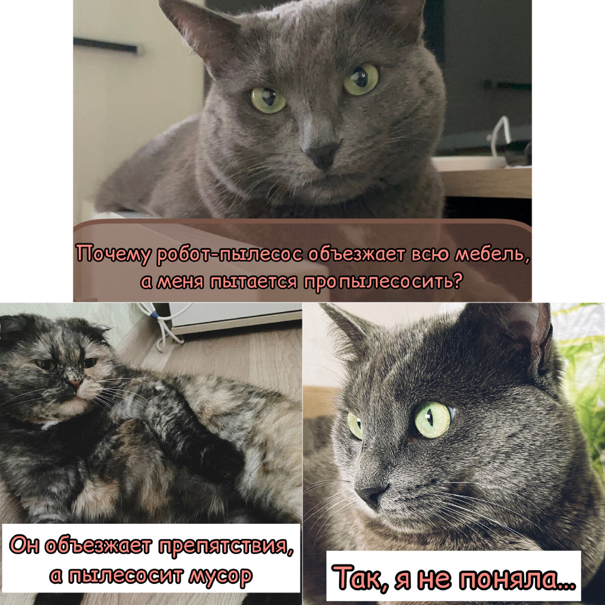 Когда у человека дома живёт кот или кошка, или две кошки, ну или три, то про плохое настроение можно забыть раз и навсегда. Только они могут, сами того не подозревая, дарить своим хозяевам массу положительных эмоций с утра и до самого вечера (и ночью ещё тоже). При наличии дома мяукающего питомца можно смело забыть про психолога, депрессию и скуку. И как только у кошек получается быть такими смешными и такими милыми одновременно? Наверное они специально готовятся, на каких-нибудь курсах "Как правильно жить с человеком, чтобы он не уставал восхищаться кошкой каждую свободную минуту". 1. Отдельная история – взаимоотношения с роботом-пылесосом. Домашние мурлыки очень быстро к нему привыкают, а порой даже начинают эксплуатировать технику в своих корыстных целях: ну там как такси, например, или как массажёр. Во всяком случае ни одна кошка не боится этого ползающего по полу пылесборника. Вот его шумный и большой собрат–это другое дело Правда и круглая машина может и обидеть маленькую