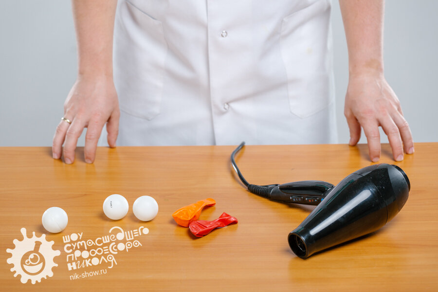 Фен и шарики Что будет, если взять шарик и подбросить его в воздух? Он, конечно же, упадет. А можно ли сделать так, чтобы он «повис» в воздухе? Нам потребуется: - фен; - шарик для настольного тенниса; - воздушный шарик. Что делаем: - для начала надуем воздушный шарик и завяжем его так, чтобы воздух из него не выходил; - включим фен и поместим в поток воздуха шарик, он улетел!!! Почему? Очень уж он легкий, а наш фен слишком мощный; - теперь пришло время для шариков для настольного тенниса, также включим фен и поместим в поток шарик – ура! Он не улетает и висит в воздухе на одном месте! - А теперь попробуй наклонить немного фен – представляешь, шарик все равно не падает – вот так научные чудеса! Почему же так происходит? В потоке воздуха создается область пониженного давления, которая и не пускает шарик в сторону, вот почему он висит в воздухе и никуда не девается. "Шоу профессора Николя" - выездные научные программы для детей от 5 до 14 лет. Наши шоу