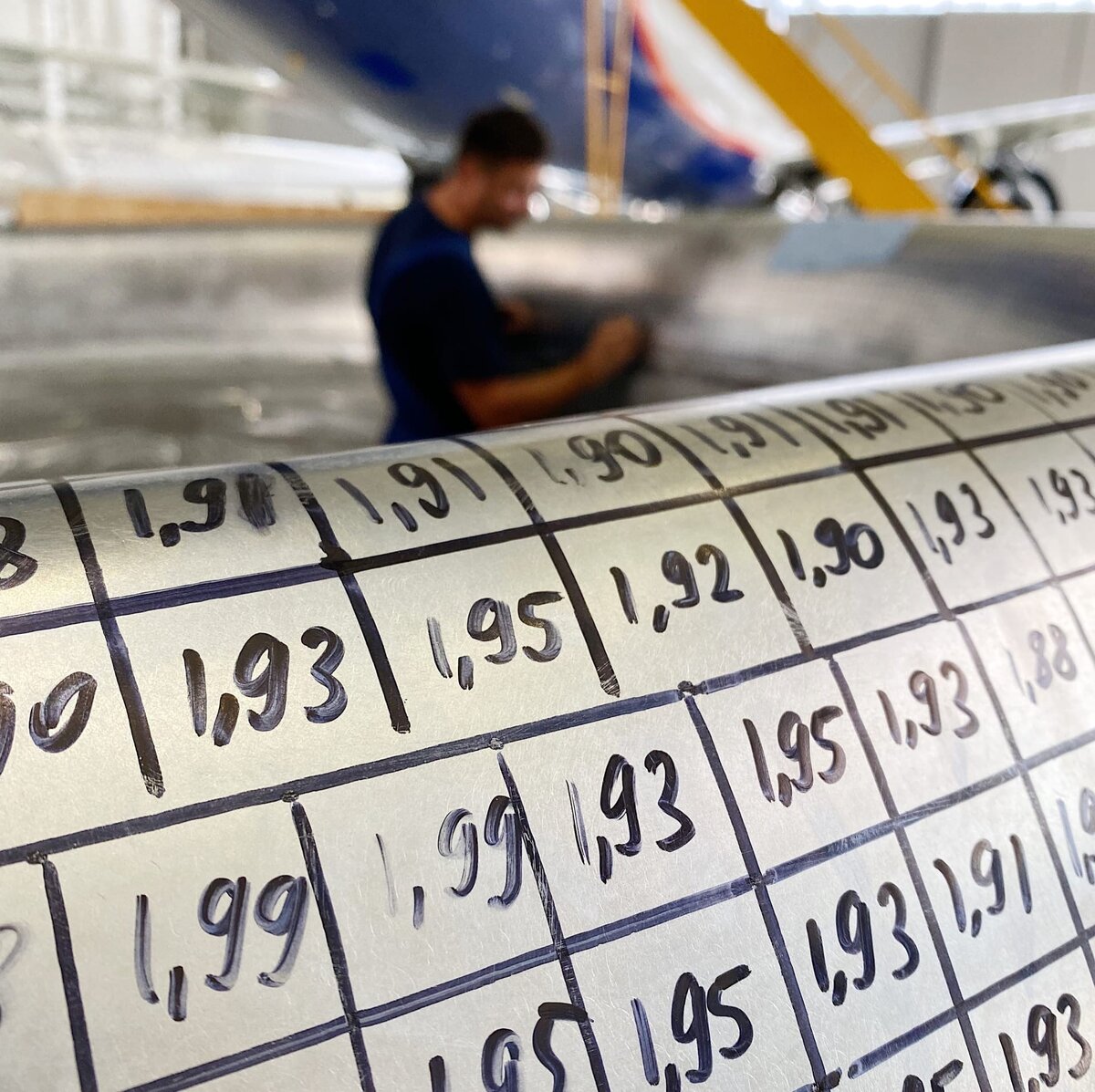 При выполнении данной процедуры наносится сетка из квадратов размером 1х1 дюйм. С помощью ультразвукового прибора выполняется замер толщины метала в пяти точках каждой ячейки: по центру и по углам. Далее на квадрат наносится среднее значение. В случае отклонения от допустимых значений принимается решение о ремонте той части детали, которая оказалась вне допуска. Больше новостей и интересных публикаций читайте в нашем telegram-канале. #atechnics #атехникс #авиакомпания #аэропорт #авиация #самолет #boeing #шереметьево #авиатехник