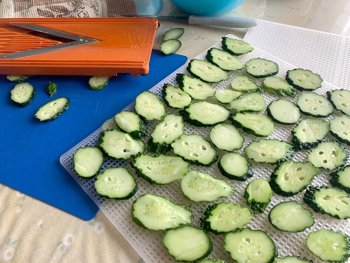 А если проще - с сушилкой для ягод, овощей и пр. Как-то писала небольшую статью что у меня в прошлом году появилось новое увлечение - пастила. Тогда я проводила самые разные эксперименты, делала из ягод и фруктов, с яблоками и без, с бананами, кабачком, тыквой.. Короче, изгалялась как могла 😆. Какими-то результатами была довольна, какими-то не очень, но было жутко интересно и увлекательно. В этот раз я решила сделать чипсы из огурцов. Я уже делала из редиски в этом сезоне, и даже собралась было прикрепить ссылку... Но поняла, что так и не написала про это. На днях обязательно исправлюсь, "клятвенно клянусь" И так - огурцы. У меня их вообще-то не много, всего 6 штучек посажено. Просто соленые и маринованные я не люблю (если только в винегрете), свежих уже в принципе наелись, так что можно и что-то новое попробовать. Нарезала на терке (моей, кстати, почти 30 лет) кружочками, толщина примерно 3мм. В этот раз не стала добавлять ни приправы, ни соль. Разложила на сетчатом поддоне и зас