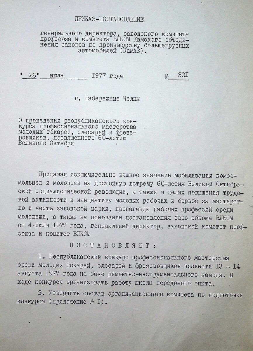 13-14 августа 1977 года на ремонтно-инструментальном заводе (РИЗ) проходил Республиканский конкурс профессионального мастерства молодых токарей, слесарей и фрезеровщиков, посвящённый 60-летию Великой Октябрьской социалистической революции. Начало конкурсу положил вот этот приказ-постановление от 26 июля 1977 года.