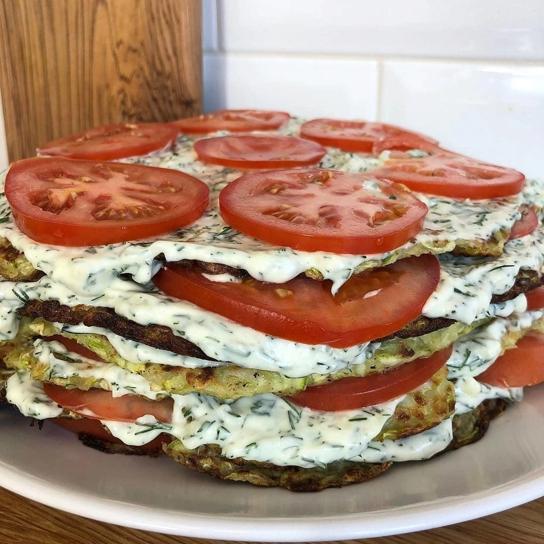 Ингредиенты: •3-4 средних кабачка •пол стакана муки •Соль, перец по вкусу •подсолнечное масло для жарки •укроп •майонез •400 гр помидоров •4-5 зубчиков чеснока ⠀ Приготовление: Натереть на крупной терке кабачки, подсолить и отжать лишнюю влагу. Далее переместить в большую миску, добавить муку, перец, соль. Далее обжарить коржи. На сковородке на небольшом количестве масла, распределив по всей сковороде массу. После того как все коржи готовы, делаем соус. Для этого смешиваем майонез с чесноком, мелкорубленным укропом, и чеснок. Далее нарезать тоненько кругляшками помидоры и можно складывать торт. Корж, соус, помидорки и повторять слои.