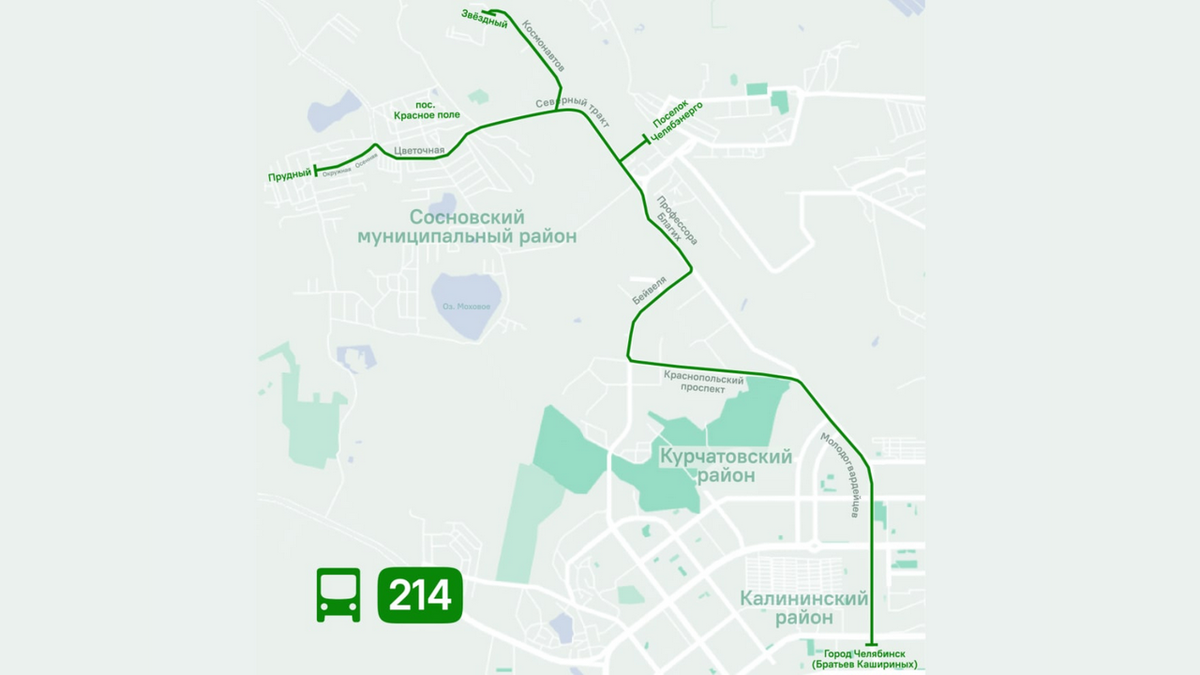 С 1 августа в Челябинске запустили новый автобусный маршрут №214 «Братьев Кашириных — Прудный». Он следует по улицам: Молодогвардейцев, Краснопольский проспект, Бейвеля, Профессора Благих, Северный тракт, Челябэнерго, Космонавтов, Белопольского, Цветочная, Осенняя, Окружная. Автобус будет ходить каждые 11 минут ежедневно. Первый рейс от Братьев Кашириных — в 6.40, от Прудного — в 5.50 ежедневно. Последний рейс от Братьев Кашириных — в 21.31, от Прудного — в 20.41 ежедневно.