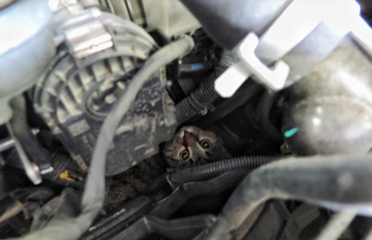 Вадим переставил Solaris в цеху на удобное для себя место - нужно было снимать бампер, открыл капот и отпрянул, нервно смеясь: "Посмотри, посмотри!" Вова подошёл к капоту и засмеялся: "Ничего себе!" Заинтересовался и я. Под капотом, прямо на декоративной накладке двигателя сидел серый кот. Увидев меня, он решил, что с него хватит, и прошмыгнул вниз между моторным щитом и агрегатами, прополз по защите и забился у вентилятора радиатора. У машины собрались все. Было и смешно, и не по себе: "клиент" явно не местный, значит, приехал на машине. Мы кратко вспомнили, что чаще всего происходит с животными под капотом движущегося автомобиля. Сошлись во мнении, что в таком случае, серому несказанно повезло. Я позвонил клиенту, и оказалось, что они знали, что кот в моторном отсеке. На моё недоумение ответили просто: "Ну не отменять же поездку!" Кратко описав, что могло бы быть, я предложил забрать пассажира и отвезти на место "подбора". Хозяйка Hyundai согласилась. Кота нужно было доставать. Подд
