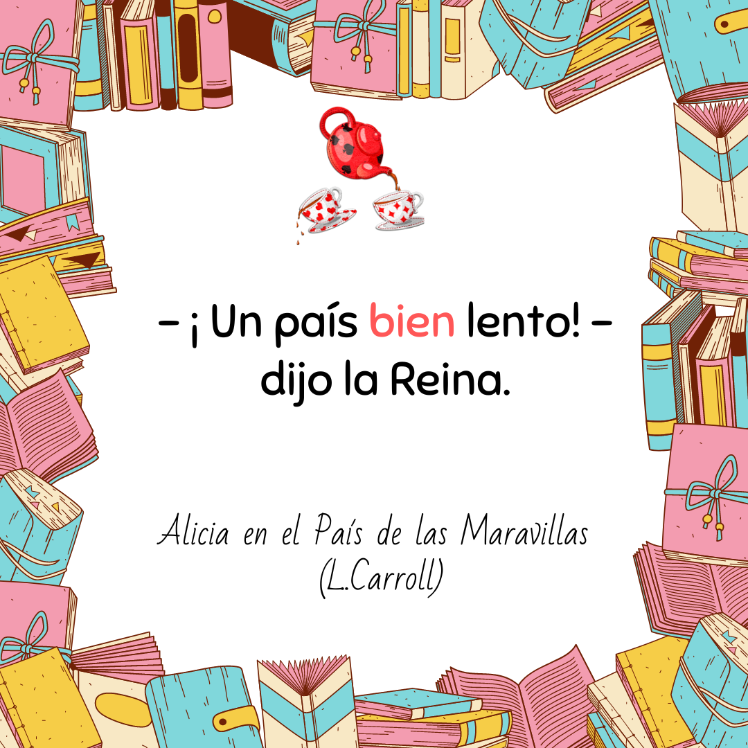 Одна из моих любимых книг на испанском языке - это "Алиса в стране чудес". Кладезь лексики и курьезных лингвистических моментов. Любимую цитату пришлось разбить на части, чтобы сделать акцент на хорошем и всем известном слове bien. Одно из первых, которое я в выучила в Испании. Однако здесь оно имеет другое значение. Bien может делать акцент и переводиться как "очень" (muy) Ставится перед прилагательным или наречием. - bien tarde (очень поздно) - bien rico (очень богатый) - bien lento (очень медленный) ♥ Перевод фразы (офиц.): Какая медленная у тебя страна, – фыркнула Королева.