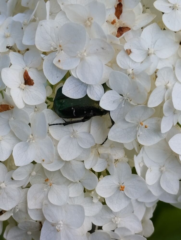 В этот раз мое пребывание на даче сократилось до минимума: утром приехал - вечером уехал, так что шибко бегать по цветочкам не удалось. Не знаю как у вас, но у нас пошли огурцы. Поэтому, задание от жены: первым делом надо их собрать, нарвать всякой травы для засолки. А также надо их полить, опять косить траву и так далее и тому подобное. Любой, имеющий дачу, знает, что дела на ней только прибавляются, сколько их не делай. Мои ящерки сегодня так и не вылезли наверх кучи мусора подремать, поэтому всё свое внимание в передохах я переключил на гортензию. Во-первых, она у нас выросла громадными белыми шарами и сейчас растет как царица всего участка. Во-вторых, почему-то на ней я не видел ни пчел ни шмелей и меня заинтересовало, кто на ней живет. Увидел вот такого насекомыша. Сначала он меня боялся, а потом перестал обращать на меня внимание. Если верить Википедии, то это нехрущ июньский или хрущ июньский (мне только одному кажется, что эти два названия противоречат друг другу?) Что он на