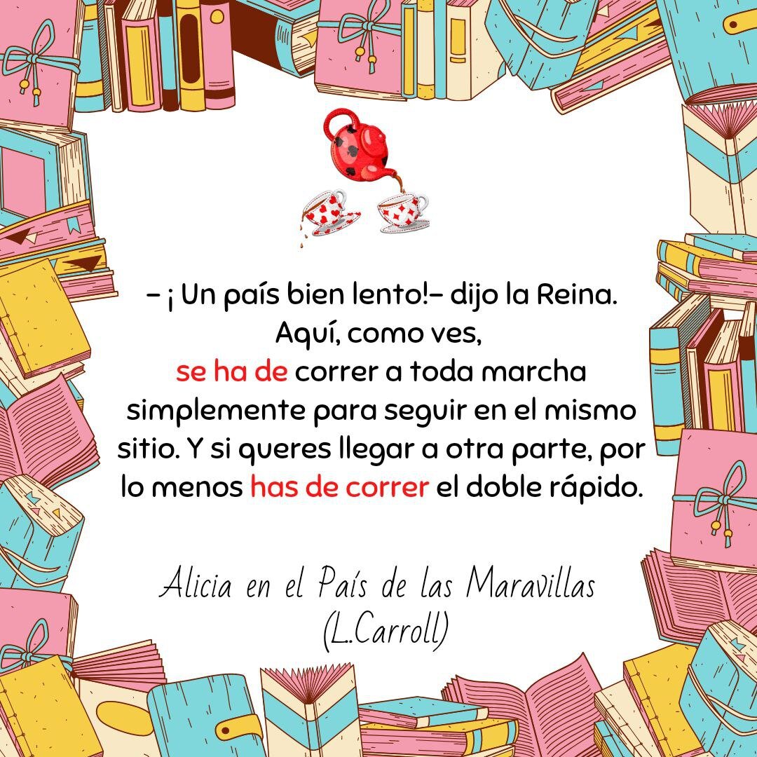И вот полная цитата во всей красе. Литературный перевод (один из): – Какая медленная у тебя страна, – фыркнула Королева. – Здесь приходится бежать что есть мочи только для того, чтобы оставаться на месте, а уж если хочешь куда-нибудь передвинуться, придётся бежать, по меньшей мере, вдвое быстрее. Помню свое недоумение на фразе,которую выделила красным цветом. ▲ Haber de + infinitivo Это книжный вариант разговорной версии tener que+ infinitivo. Haber de + infinitivo выражает необходимость, долженствование. В этом случае спрягается только глагол haber. Например: Has de correr - тебе необходимо бежать, ты должен бежать. He de leer - я должен прочитать. Has de hacerlo - ты должен сделать это. Испанский - это точно страна чудес. ¡Hemos de aprenderlo!