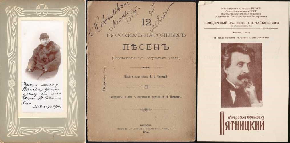 В фондах Музея музыки сохранился фотопортрет выдающегося музыканта, создателя Русского народного хора Митрофана Ефимовича Пятницкого с трогательной дарственной надписью музыканту-этнографу Вячеславу Пасхалову: «Дорогому, милому Вячеславу Викторовичу от любящего Митофана Пятницкого. 22 января 1904 года». Сын священника, Митрофан Ефимович окончил духовное училище. Затем он обучался в Воронежской семинарии, но позже бросил учёбу и переехал в Москву. В 1902 году Пятницкий задумал создать народный хор. И начал он с записи песен, которые собирал по деревням его родной Воронежской губернии. В 1903 году Пятницкий стал членом музыкально-этнографической комиссии при Московском университете. Тогда же состоялось его знакомство с музыковедом-этнографом Вячеславом Пасхаловым. Вместе они составили сборник «12 русских народных песен Воронежской губернии Бобровского уезда», записанный с голоса Пятницкого, в гармонизации Пасхалова. Работа проходила так: Сначала Пасхалов записывал с голоса Митрофана Ефим
