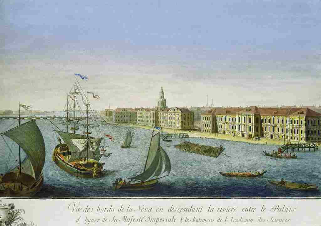 Рассматривая гравюры и фотографии с видами Университетской набережной Петербурга, невольно цепляешься взглядом за внешний облик первого музея в России Кунсткамеры. И понимаешь, что наше современное представление об облике Кунсткамеры сильно отличается от представления жителей Петербурга 18-19 века. Идея создать "кабинет редкостей" и библиотеку зародилась у Петра Великого в 1714 году. А вот строительство здания Кунсткамеры началось в 1718 году. Но коллекция музея уже была доступна для всех желающих на Первой Береговой линии (ныне Шпалерная улица) в Кикиных палатах. Помимо редкостей в палатах находилась и личная библиотека Петра I. Это 15 тысяч томов! Лишь спустя два года после смерти Петра I в 1727 году коллекции музея переезжают в недостроенное здание на Васильевском острове, а само строительство завершилось 1734 г. Главный фасад здания, обращенный к Неве, состоит из двух симметричных корпусов, объединенных трехъярусной башней. Башня придает всему сооружению живописный и запоминающи