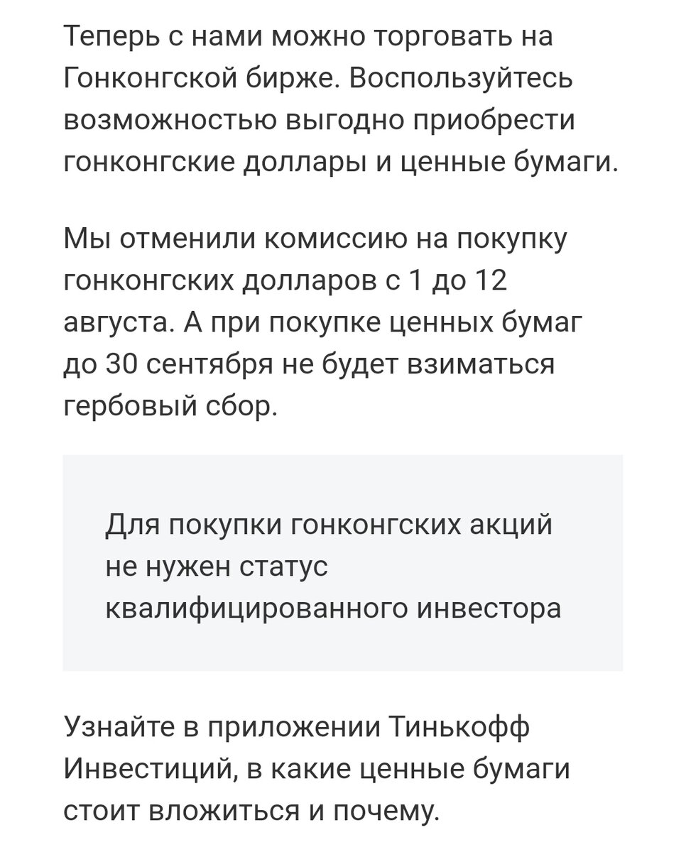 Тинькофф предлагает начать торговлю акциями на Гонконгской бирже. 🍏Плюсы: Нет комиссии... Нет гербового сбора. Статус квала не нужен. Д - диверсификация. По странам и валюте. А значит и снижение рисков. 🍎Минусы: - Если запретят иностранные акции со стороны РФ, то и данные бумаги так же могут попасть под блокировку. - Депозитарная цепочка. Тут не все до конца понятно, но думаю что есть риск со стороны иностранных партнёров. - Риск со стороны Китая. Обстановка вокруг Тайваня накаляется. Какие компани нам предлагают купить в первую очередь? 🍎Алибаба. Прибыль падает. Есть риски делистинга в США. 🍎Meituan. Интернет компания. Объем транзакций растёт на 35 пр в среднем в год. Отрицательный чистый долг. Рентабельность тоже отрицательная, что не очень хорошо. 💡Xiaomi. Производитель электроники: умные устройства, телефоны и тд. Компания занимает третье место в мире по выпуску смартфонов (после Apple и Samsung). У компании хороший запас наличности. При этом не очень высокая