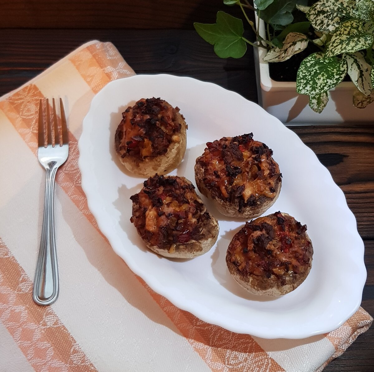 Выкладываем в шляпки грибов нашу начинку и отправляем их в разогретую духовку на 30-40 минут при 180 °С до образования золотистой корочки. Приятного аппетита!