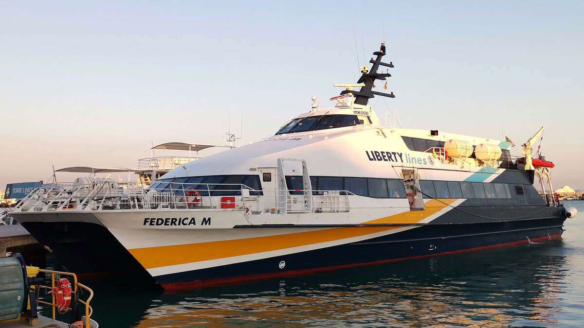 А вот Federica M ежедневно трудится в Италии в компании Liberty Lines в составе флота из 32 кораблей, вмещающих от 180 до 320 человек способных работать на скоростях 30-38 узлов, принося прибыль своим владельцам. Вот и мои 27 евро за билет в оба конца получили.