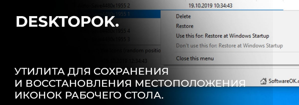 DesktopOK — портативная программка, которая предназначена для сохранения и восстановления местоположения иконок на рабочем столе. Утилита умеет запоминать различные настройки пользователей, сохранять позицию иконок для разных разрешений экрана, автоматически скрывать и отображать иконки, а также сворачивать все открытые окна. Имеется функция автосохранения. #рабочийстол #иконки #местоположение