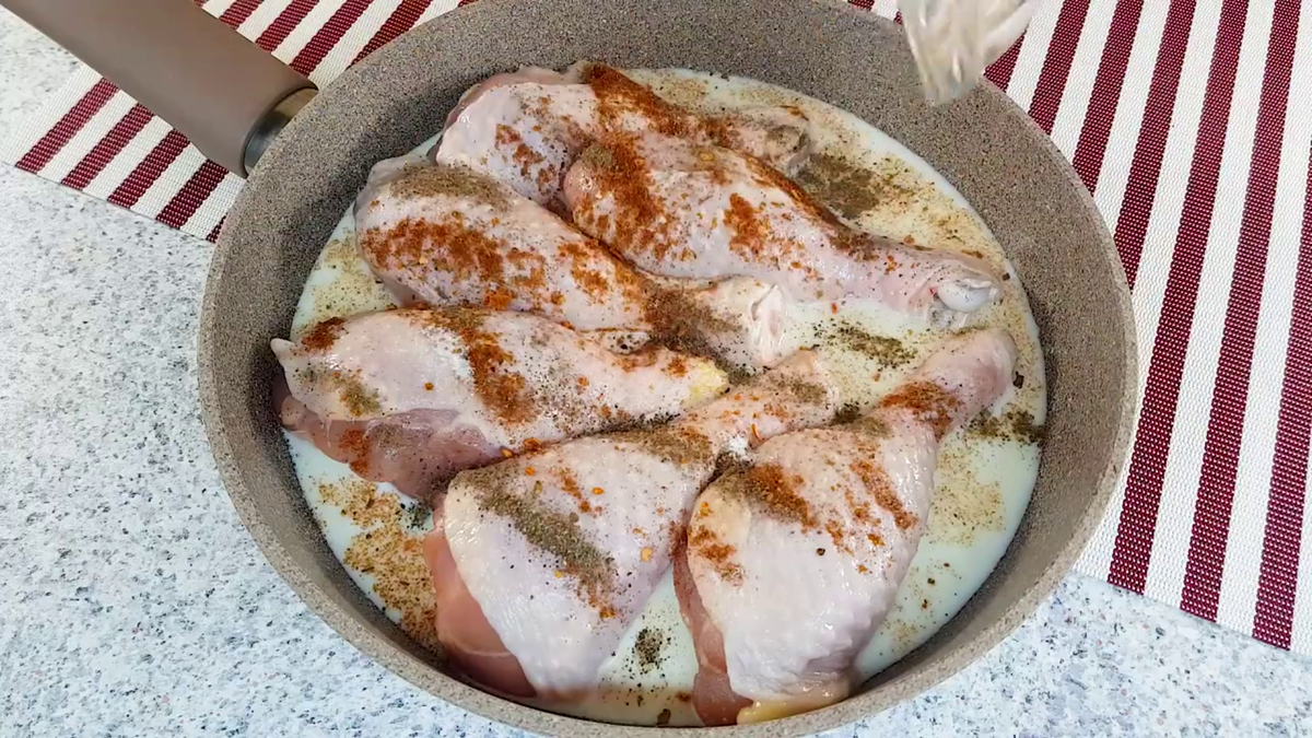 Это блюдо возможно готовить из цельной курицы, но я люблю больше всего - бёдрышки, ими мы и воспользуемся. Мясо получается настолько мягким, что само тает во рту. Кроме этого, получается сочный куриный бульончик который прекрасно подойдет к вареным макаронам. Именно поэтому рекомендую сделать так же как я. Ингредиенты которые нам понадобятся: - 1 кг куриных окорочков - 200 мл молока - паприка сушеная, соль, перец черный молотый - 2 яйца - 50 мл молока - 1/2 чайной ложки сушеного орегано - 1/2 стакана (200 мл) панировочных сухарей - 1/2 стакана (200 мл) муки - 1/2 чайной ложки соли Берем 5 штук красивых куриных голени. Раскладываем их на разогретую сковороду. Далее самое главное действие - заливаем куриные окорочки 200 мл молока, сверху паприка сушеная, соли и перец черный. Тушить под крышкой на среднем огне около 20 минут. Чтобы курица получилась хрустящей и сочной изготовим панировочную смесь - отдельно вбиваем 2 яйца, 50 мл молока и 1/2 чайной ложки сушеного орегано. Отдельно нужно