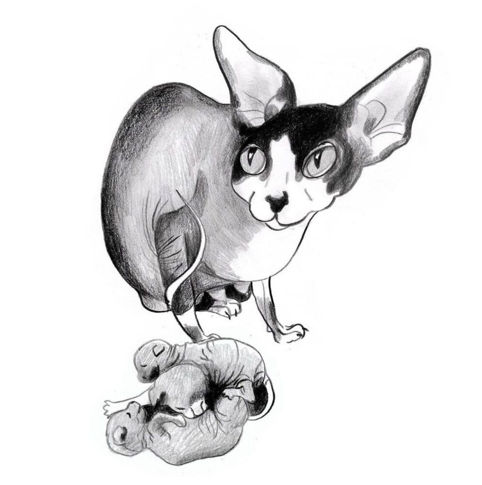 Есть темы, которые меня вдохновляют постоянно, каждый день. Не всегда есть возможность рисовать что-то свое, а не по работе. Но если выдается минутка, я обязательно что-нибудь рисую для себя. И вот такой темой для меня является мой КОТ ХОППЕР породы канадский сфинкс. Сделала подборку рисунков Хоппера. Расскажу немного про техники и мои задачи в каждой зарисовке. Тут Хоппер только родился. У меня была фотография его мамы с котятами - я, переполненная эмоциями, сделала такой рисунок. Где-то там малыш Хоппер :) Вы знаете, я не люблю срисовывать фотографию, как копию. Мне захотелось сделать более менее стилизованный рисунок. Я увеличила голову и уши маме и постаралась нарисовать ее взгляд, чтобы он приковывал внимание. Это Хоппер подрос и спит. В свитере! Потому что он совсем голенький, как все сфинксы. Любимая подушка - панда из идеи. Черно-белый рисунок - самый простой, не надо думать цвете. К тому же, кот Хоппер сам серо-черный, так что зарисовка черным карандашом с разным нажимом -