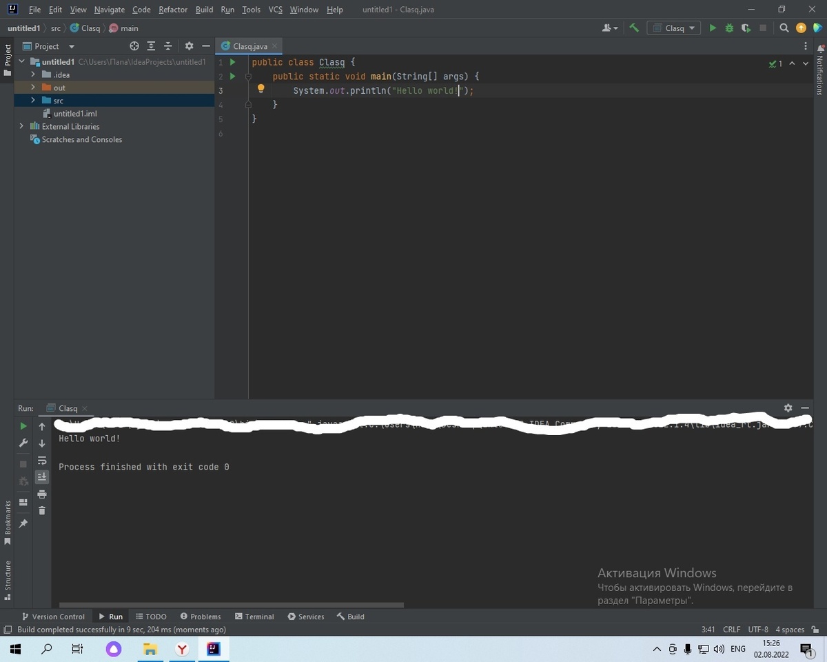 - И вот когда я выбрал путь пиратства, я быстренько откопал торрент этого курса и поставил на установку. И вот сегодня я посмотрел первую серию видеороликов из него. Первым делом требовалось установить установить среду разработки под названием "intellij idea", этот этап дался мне весьма просто (Ну а что собственно в нем молго пойти не так?). И сразу же после установки, я приступил к написанию своей первой программы "Hello world".