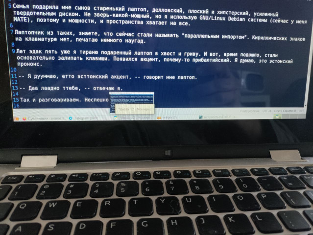 Мой первый лаптоп (тошибовский, бизнес-класса) проработал 9 лет. В какое-то утро не включился экран. Я очень переживал, но тут ничего не поделать, сейчас проще и дешевле взять новый, чем разбираться со старым. Семья поступила мудро: подарила мне сынов старенький лаптоп, делловский, плоский и немножко хипстерский, усиленный твердотельным диском. Не зверь-какой-мощный, но я использую GNU/Linux Debian системы (сейчас у меня MATE), поэтому и мощности, и пространства хватает на все. Лаптопчик из таких, знаете, что сейчас стали называть "параллельным импортом". Кириллических знаков на клавиатуре нет, печатаю немного наугад. Лет эдак пять уже я тираню подаренный лаптоп в хвост и гриву. И вот, время подошло, стали основательно залипать клавиши. Появился акцент, почему-то прибалтийский. Я думаю, это эстонский прононс. – Я дууммаю, етто эсттонский акцент, – говорит мне лаптоп. – Даа лаадно ттебе, – отвечаю я. Так и разговариваем. Неспешно. Но, в связи с последними событиями, я опасаюсь, что нача