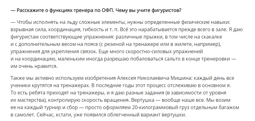 Во время межсезонья на просторах Интернета редко можно найти материалы, которые были бы посвящены непосредственно фигурному катанию, а не досугу любимых фигуристов. Если вы успели немного подустать от светских новостей, предлагаю вашему вниманию познавательное и любопытное интервью с тренером по ОФП Егором Чёлошкиным, который уже 7 лет работает в группе Алексея Николаевича Мишина.
