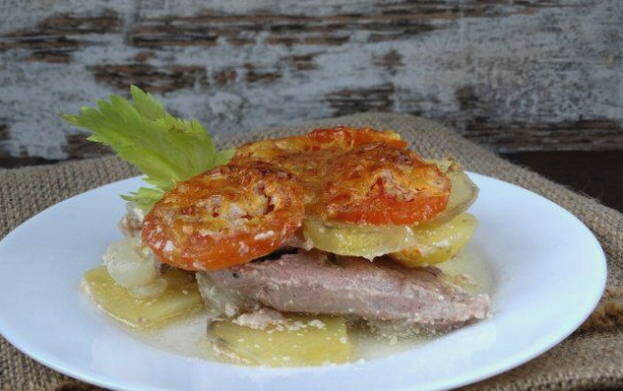 Приготовить очень популярное и невероятно вкусное горячее блюдо из сочных кусочков свинины, с добавлением сочных томатов, пикантного сыра и слегка жгучего репчатого лука. Такое кушанье идеально подходит для полноценного обеда или ужина. Ингредиенты Свинина 300 гр. Картофель 4 шт. Лук репчатый 2 шт. Помидор 2 шт. Сыр 100 гр. Сметана 3 ст.л. Горчица 1 ст.л. Лимон ½ шт. Соль по вкусу Перец чёрный молотый по вкусу Шаги Шаг 1. Маринуем мясо: свинину нарезаем кусочками, посыпаем солью и черным перцем, сбрызгиваем лимонным соком – перемешиваем и оставляем на 15 минут для пропитки. Шаг 2. Репчатый лук очищаем и режем толстыми колечками, выкладываем на дно формы для запекания в один слой. Шаг 3. В отдельной пиале соединяем компоненты для соуса: сметану и горчицу, подсаливаем – размешиваем. Шаг 4. Полученной заправкой промазываем луковые кольца. Шаг 5. На овощную «подушку» раскладываем маринованное мясо. Шаг 6. Снова смазываем соусом. Шаг 7. Очищенную картошк