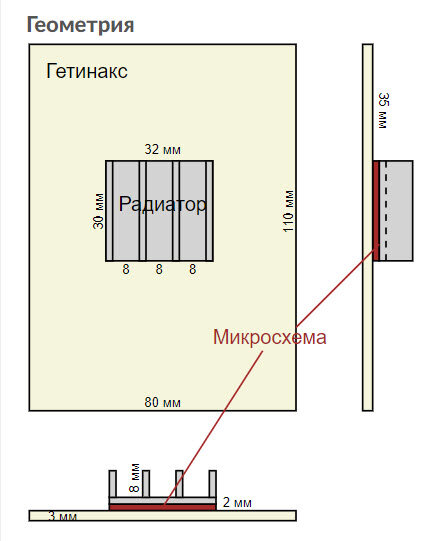 Теплопроводности материалов: алюминий 200 Вт/м°C, корпус микросхемы 20 Вт/м°C, гетинакс 0.23 Вт/м°C. Решение