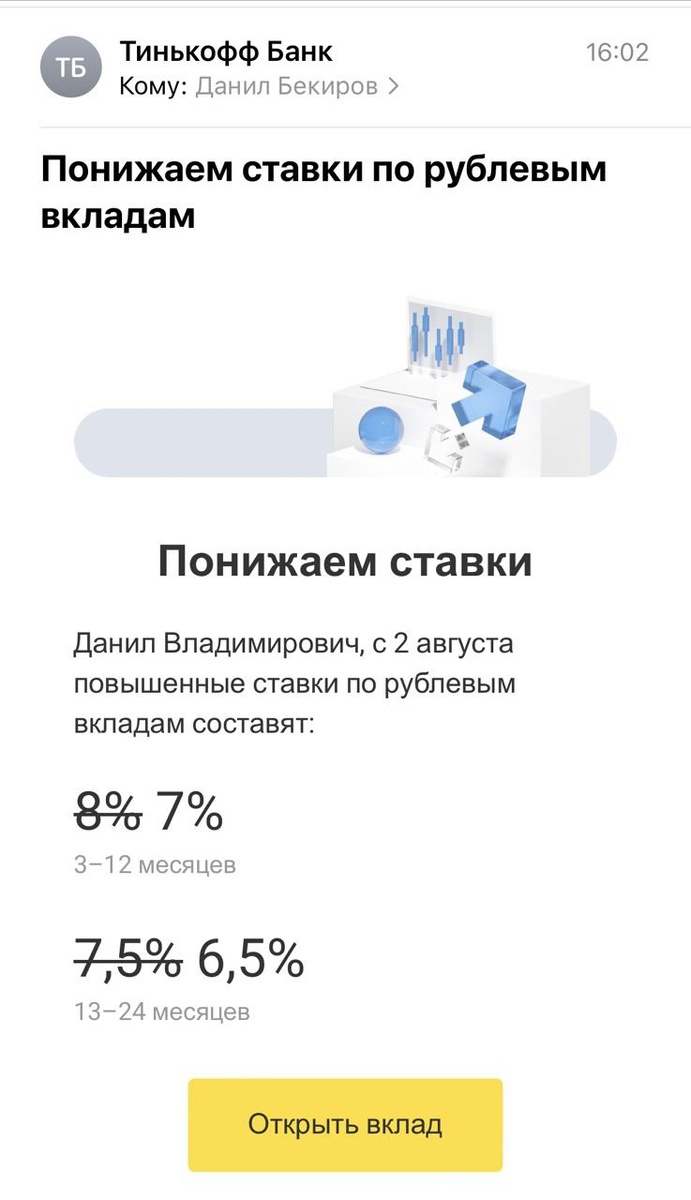 🔷 Банки снижают ставки Вчера получил письмо от Тинькофф. Добро пожаловать в новые условия - без ставок по депозитам, без доллара в свободном обращении, с доходностью по недвижимости в районе 2-4%. Ну и инфляцией только официально на уровне 15-17%. Интересно, где сейчас можно получать 20-30-50% годовых, делая это безопасно на недвижимости?