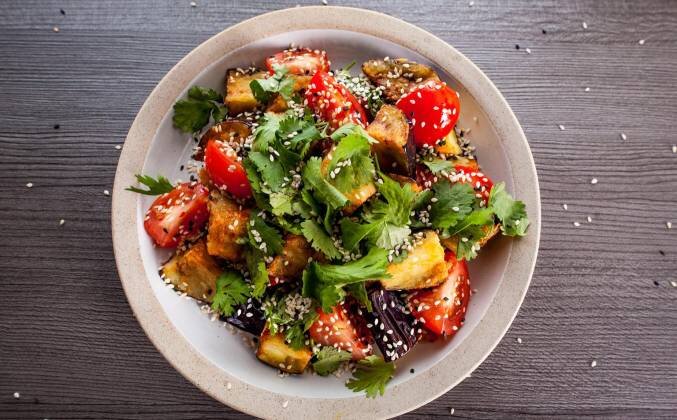 Соль 1. У баклажана отрезать зелёную часть и нарезать на крупные кусочки. Добавить к баклажану кетчуп и перемешать. Добавить к баклажану кукурузный крахмал и обвалять со всех сторон. 2. Отправить баклажан в кипящее растительное масло (500 мл), перемешать шумовкой и через 2 минуты переложить баклажан на тарелку с бумажной салфеткой. Выжать сок ½ лимона, добавить мёд, мелко нарезать чили, налить 20 мл растительного масла и перемешать. Помидоры черри разрезать на 4 дольки и переложить в салатник. 3. К помидорам переложить баклажаны, нарвать руками кинзу, полить 4 ст. ложками заправки и посолить щепоткой. Всё перемешать и переложить на порци
