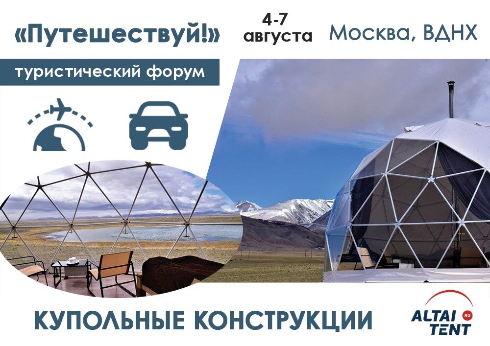 Здравствуйте! Приглашаем посетить демонстрационный купол компании «Алтай-Тент» на туристическом форуме «Путешествуй!» (4-7 августа, Москва, ВДНХ, площадь Промышленности, возле павильона № 57).