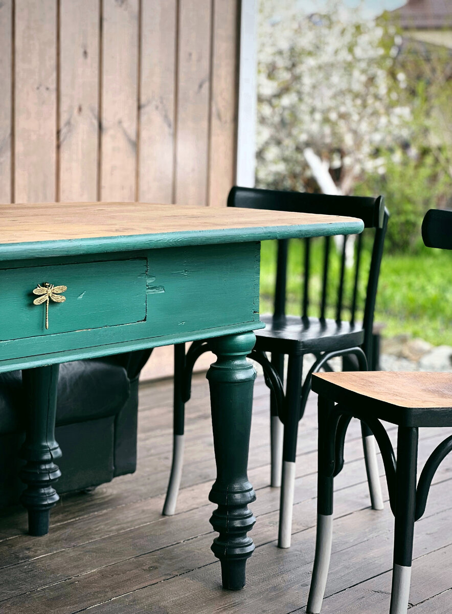 На выдвижном ящике были несколько отверстий от старой ручки. Я зашпаклевала их и после высыхания, зашкурила поверхность. Так же сделала одно отверстие по центру для новой ручки. Больше ничего не шпаклевала намерено. Все трещины и сколы, все исторические нюансы на этом столе для меня интересны и красивы. Столешницу затонировала морилкой для дерева Подстолье покрасила меловыми красками. Материалы наносила кистями, мягкий градиент от «Британского зеленого» к «Черному бархату» создавала тоже ими. И вишенка на торте это новая ручка в виде стрекозы. Стол стоит на в