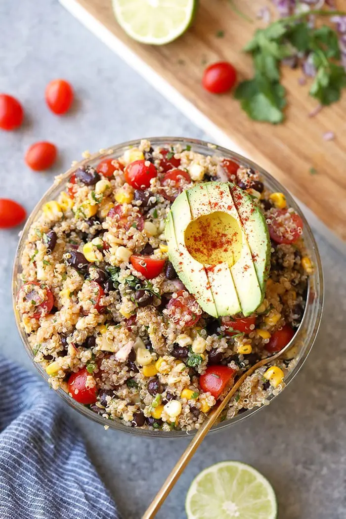Свежий, насыщенный, сбалансированный и вкусный салат с мексиканским акцентом. Он несомненно добавит яркости любому столу! Киноа давно и прочно заняло свое место на кухне людей, следящих за своим здоровьем и фигурой благодаря своему составу. Злак содержит все 9 незаменимых аминокислот и полноценный белок. Наш рецепт салата веганский, но несмотря на это очень сытный. Он может стать как полноценным обедом так и закуской перед основным блюдом! Ингредиенты: киноа: 1 стакан вода: 2 стакана черная фасоль: 1 банка (425 гр.) промытая водой сладкая кукуруза: 1 банка (425 гр.) помидоры черри: 1 уп. (нарезанные пополам) красный лук: 1/4 большой луковицы (измельченный) авокадо: 1-2 шт. спелых (для подачи) ДЛЯ ЗАПРАВКИ оливковое масло: 1/3 стакана свежая кинза: 1/4 стакана мелко нарезанной яблочный уксус: 1 ст.л. сок лайма: 1/4 стакана молотый тмин: 1/2 ч.л. чили (порошок): 1/2 ч.л. чесночный порошок: 1/2 ч.л. жидкий мёд: 1/2 ч.л. копченая паприка: щепотка соль: 1/8 ч.л. Способ приготовления: 1.