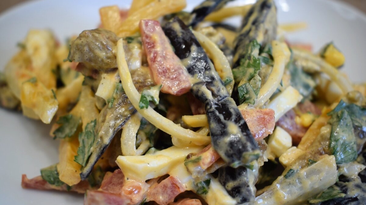 В сезон обильного урожая на приусадебном участке всегда много экспериментирую с новыми рецептами. Так и в этот раз решил попробовать что-нибудь новенькое Ингредиенты: Баклажаны – 2 шт Соль – 1 ч.л. Лук – 1 шт сахар – 1 ч.л. Перец сладкий – 1 шт Помидоры – 2 шт Петрушка Яйца вареные – 2 шт Перец черный молотый Чеснок – 1 зубчик Майонез – 2 ст.л. Рецепт приготовления: Берем два баклажана средних размеров, рецем на небольшие брусочки, добавляем одну чайную ложку соли, перемешиваем и оставляем на 20 минут. Потом баклажаны необходимо будет промыть, чтобы ушла лишняя горечь. Одну луковицу рецем полукольцами, добавляем одну чайную лжку сахара и заливаем кипятком. Через пять минут кипяток необходимо слить. Промытые баклажаны обжариваем на среднем огне (на растительном масле), до золотистого цвета. В миску режем один сладкий перец, два помидора,петрушку, два вареных яйца, добавляем обжаренные баклажаны, маринованный лук, черный молотый перец (по вкусу), один зубчик чеснока через пресс, и две с