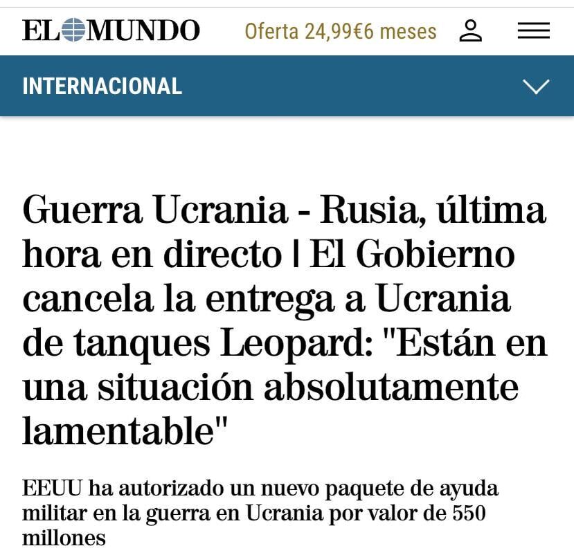 Газета El Mundo сообщает, что Испания отказалась от идеи поставлять на Украину танки Leopard 2, так как они находятся в "абсолютно плачевном состоянии". "Мы сегодня рассматриваем все возможности, но я уже могу вам сказать, что Леопарды, которые не используются на военной базе Сарагосе в течение многих лет, невозможно отправить на Украину, потому что они находятся в абсолютно плачевном состоянии", - заявила Министр обороны Маргарита Роблес. "Были соответствующие проверки, которые показали, что танки находятся в состоянии, при котором они не могут быть использованы. Мы не можем дать их Украине, потому что они будут представлять опасность для них самих", - добавила Роблес. #россия #войнанаукраине #спецоперация #войнанадонбассе #испания #украина #санкции #танки #санкции #кризис