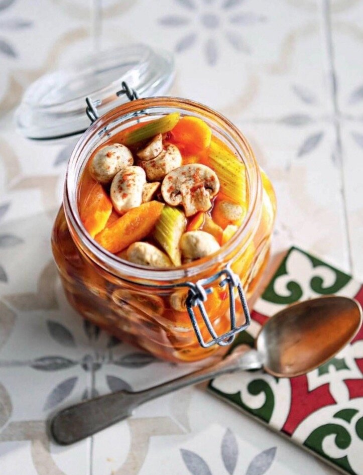 Грибы, морковь и сельдерей переложим в банки. Зальем горячим рассолом. Накроем крышкой и оставим на сутки.