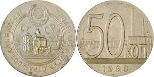 В 1928 году сворачивается НЭП, страна переходит к плановой экономике, начинаются Великие стройки. Правительство ищет всевозможные источники доходов, поэтому выпуск крупных серебряных монет прекращается. В 1931 году заканчивают производить и мелкие серебряные монеты, заменяя их более дешёвыми из медно-никелевого сплава. На Ленинградском монетном дворе позже были найдены штемпели для изготовления 50-копеечников нового типа с изображением заводов и трактора (вместо выпускавшихся до этого полтинников с кузнецом). В начале XXI века в частной коллекции оказался и единственный известный экземпляр самой монеты, который был продан в 2011 году на аукционе «Знакъ» за 10 миллионов рублей.