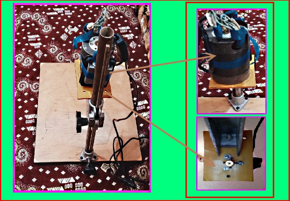 На этот раз в материале статьи будет отражена информация о самодельных сверлильных устройствах, с использованием двигателей переменного и постоянного токов. Сверлильные устройства выполнены в стационарном и ручном исполнении, с использованием различных зажимных устройств. 1. Наибольший интерес представляет стационарный вариант с использованием станины от фотоувеличителя, с установленным на нем двигателем переменного тока. На ось двигателя насажен патрон, в качестве которого использовано зажимное цанговое устройство. Перемещение сверла к детали осуществляется органом перемещения фотоувеличителя, расположенным на стойке сбоку станины. 2. Сверлильное устройство выполнено в мини варианте. Цанговый патрон насажен на ось двигателя постоянного тока. Двигатель зафиксирован в цилиндре от шприца из-под краски для принтера. 3. Ручной экземпляр с зуботехническим наконечником, насаженным сразу на ось двигателя. Для передачи вращения в оси был сделан пропил. 4. Инструмент со стоматологиче