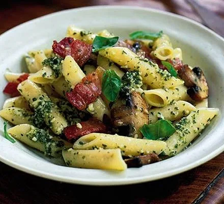 Простое блюдо из пасты с беконом, грибами и соусом песто на одной сковороде