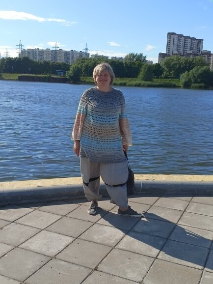 Вязанное платье "Морской прибой" Это платье я вязала с мечтами о море. Море в этом году не состоялось, а платье да. Связано оно из ниточки YarnArt Flovers. Цвета нити напоминают морской берег: песок, голубую воду и серую гальку. Мне понадобилось две бобики этой великолепной ниточки. Одну я вязала прямо из бобинки, а вторую перемотала и вязала в "обратном направлении". Из центра бобинки отмотала два перехода цвета на рукава. Пока я не умею вставлять схемы, буду описывать, благо данный узор прост. Начало вязания сверху по принципу кокетки. Увеличение количества столбиков производилось в рядах со столбиком с накидом. Сам узор: первый ряд- столбик с накидом, второй и третий - столбик с накидом и воздушная петля (по принципу филейной сетки), четвертый, пятый и шестой повторение первого, второго и третьего ряда, седьмой - столбик с накидом, восьмой - скрещенный столбик с двумя накидами, девятый, десятый ряды - повторение седьмого и восьмого. Будут вопросы, дорогие крючко- и спице- тв