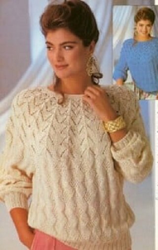Размеры: 38/40 (42/44) Вам потребуется: хлопчато-вискозная пряжа (дл. 120 м/50 г) натуральная или голубая 700 (750) г, круговые спицы № 3 и № 3,5. Резинка (спицами № 3): попеременно 2 лиц. п. и 2 изн. п. Узор планки (спицами № 3): попеременно 1 круг лиц. п. и 1 круг изн. п. Все последующие узоры вязать спицами № 3,5. Основной узор: вязать по схеме 1. Узор кокетки: вязать по схеме 2. Плотность вязания основного узора: 23 п. и 30,5 р. = 10 х 10 см. ПЕРЕД/СПИНКА. На спицы набрать по 98 (106) п. и вязать 7 см резинкой, причем в последнем р. равномерно прибавить 35 (37) п. = 131 (141) п. + 2 кром. п. Затем вязать основным узором. На высоте 32,5 см от начала закрыть с обеих сторон 2 п. и в каждом 2-ом р. 8 раз попеременно 1 раз 1 п. и 1 раз 2 п. = 105 (115) п. На высоте 39 см все п. снять. [cut] РУКАВА. На спицы набрать по 50 (54) п. и вязать 6 см резинкой. При этом в последнем р. равномерно прибавить 29 (25) п. = 77 п. + 2 кром. п. Далее вязать основным узором, начиная от стрелки. Для скос
